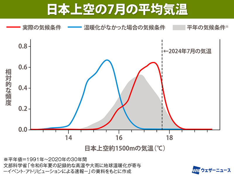 薄灰色の部分は、平年値(1991年~2020年の30年間)の7月の頻度分布です。黒の点線は今年の7月の実況である17.6℃付近に引かれています。