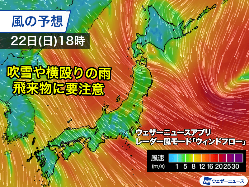 雪や雨が降る日本海側では吹雪や横殴りの雨に、晴れているところでも飛来物などによる危険があるため油断できません。また、交通機関への影響も懸念されるため、最新の情報をご確認ください。