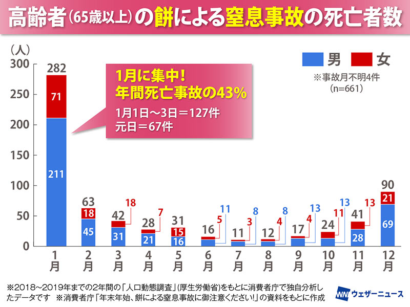 お餅による65歳以上の窒息死亡事故は、年間死亡者数の43%に及ぶ282人が1月に集中。さらに1~3日の正月三が日に127人、元日の1日が67人と際立った集中ぶりを示しています。