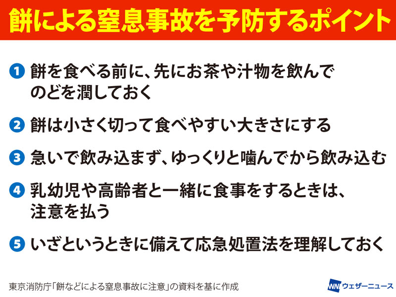 「まず、餅などを食べる前にお茶や汁物を飲んで、のどを潤しておくようにしましょう。そのうえで食べやすい大きさに小さく切っておき、食べる時は急いで飲み込まず、ゆっくりと噛んでから飲み込んでください。