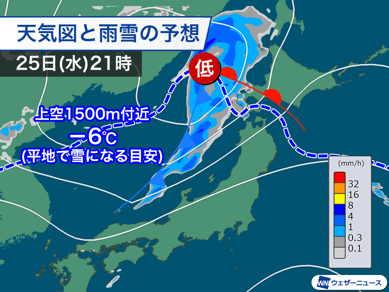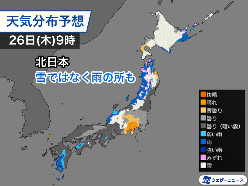 明日26日(木)の朝にかけて雪や雨の範囲は拡大し、北日本の各地や北陸などに広がります。低気圧や前線に向かって南からやや暖かな空気が流れ込むため、北日本の平野部では雪ではなく雨の降る所がある予想です。