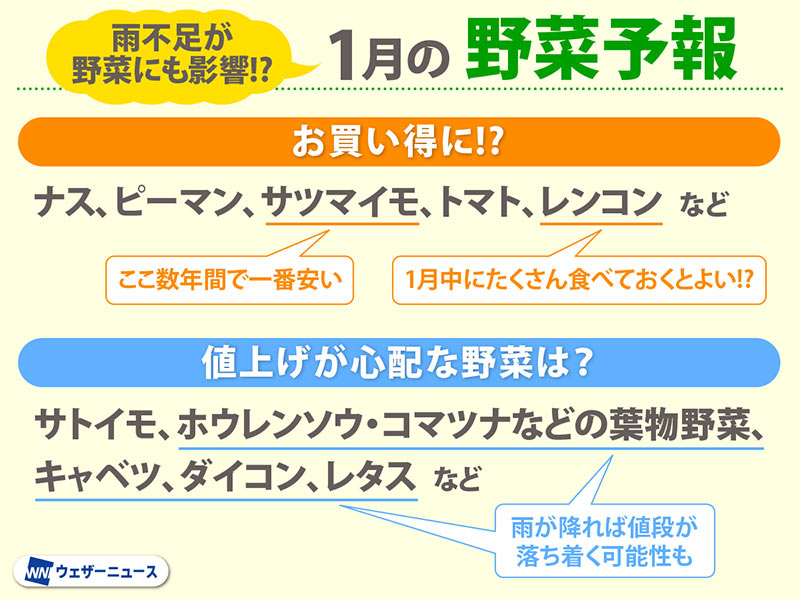 1月の野菜は全体に、関東などの雨不足の影響を大きく受けているといいます。