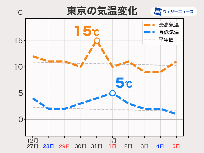 寒気が流れ込みやすく、年末年始は全国的に冬らしい寒さの日が多くなります。低気圧が通過する大晦日は一時的に寒気が北へ退くため、年越しのタイミングは西日本、東日本を中心に少し寒さが落ち着きそうです。