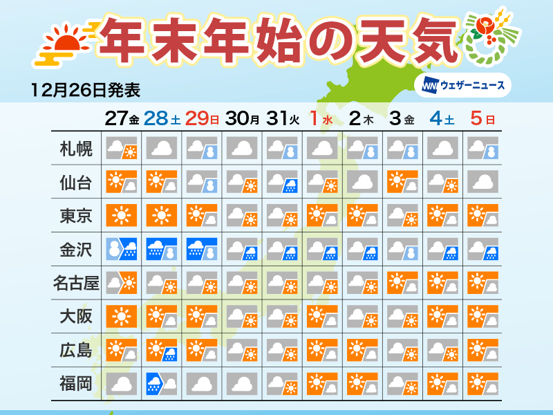 年末年始は冬型の気圧配置の日が多くなります。30日(月)頃は一時的に冬型が緩み、大晦日は低気圧が日本付近を通過する見込みです。