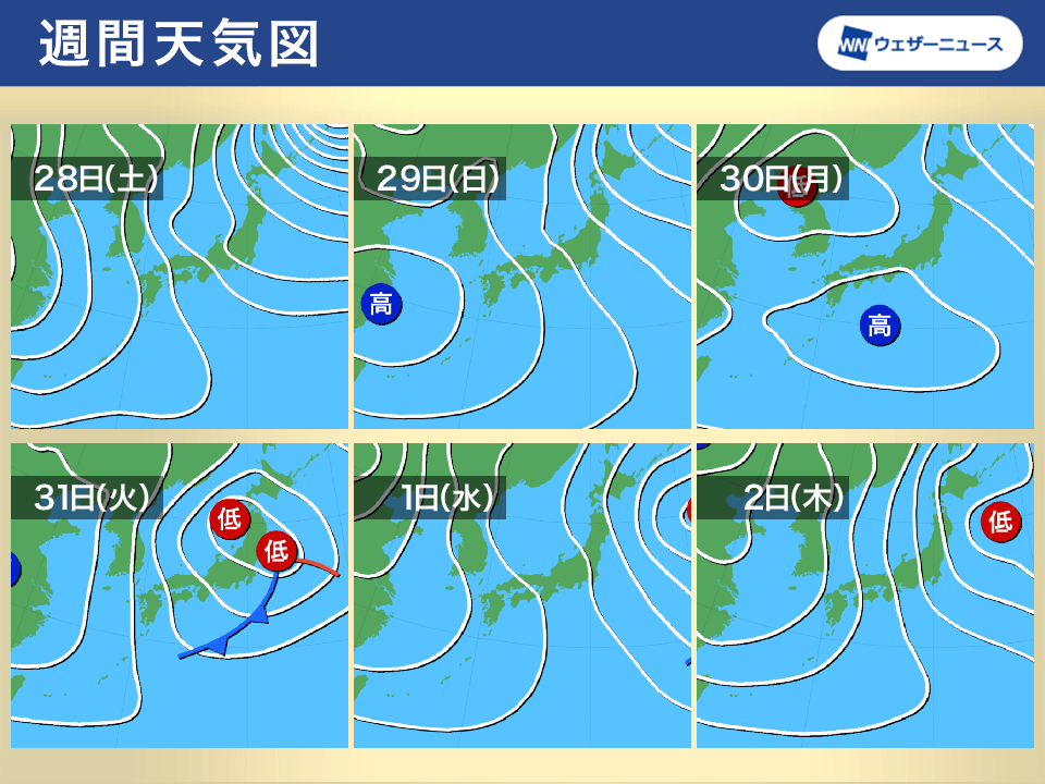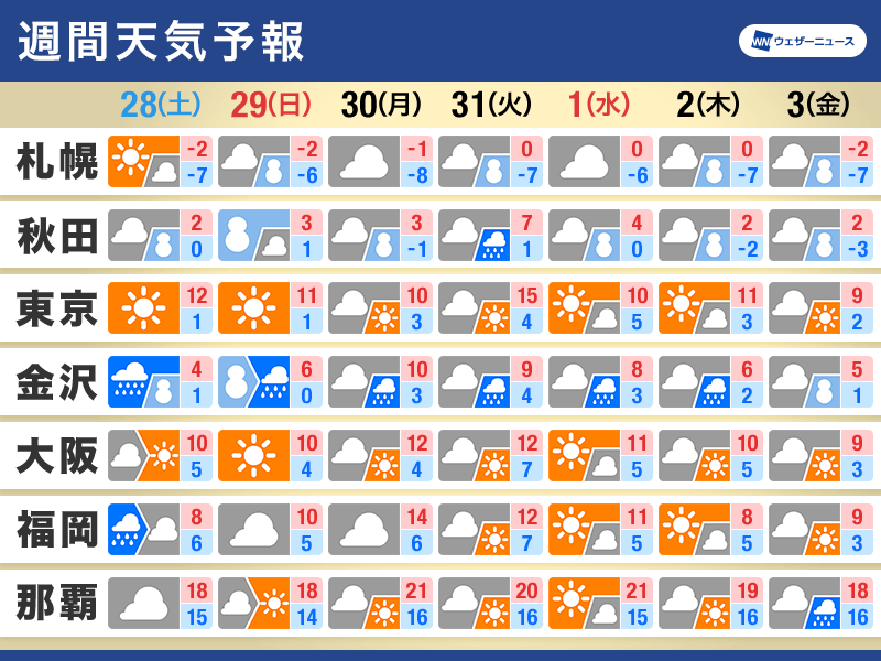 29日(日)は次第に冬型の気圧配置が緩み、寒気の流れ込みはピークを越えます。30日(月)は全国的にみると比較的穏やかな一日となりそうです。