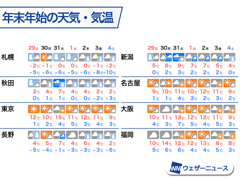 明日29日(日)も気温は低めですが、明後日30日(月)から大晦日の31日(火)はいったん寒さが和らぐ見込みです。特に関東は気温が上がり、31日(火)の東京の最高気温は15℃まで上がる予想です。年越しは、極端な冷え込みにはなりません。