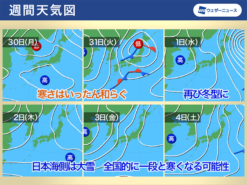 しかし、年が明けると再び冬型の気圧配置になります。元日1月1日(水)は段々と上空に強い寒気が流れ込み、全国的に気温が低くなる見通しです。