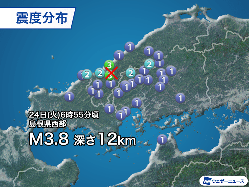 24日(火)6時55分頃、島根県西部を震源とするマグニチュード3.8、深さ12kmと推定される地震が発生しました。この地震で島根県浜田市と益田市で最大震度3を観測しています。