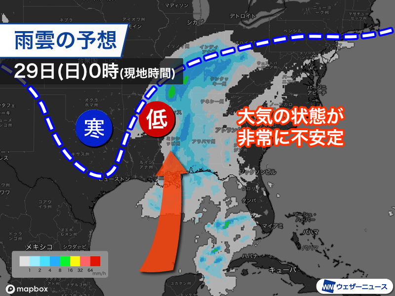 低気圧や前線がアメリカ南東部のミシシッピ州やアラバマ州を通過しています。低気圧の北側からは上空5500m付近で−20℃前後の寒気が流れ込んでいる一方で、メキシコ湾からはこの時期としては暖かく湿った空気が流入し、大気の状態が非常に不安定です。竜巻などの発生しやすさを示す指標も非常に高くなっています。
