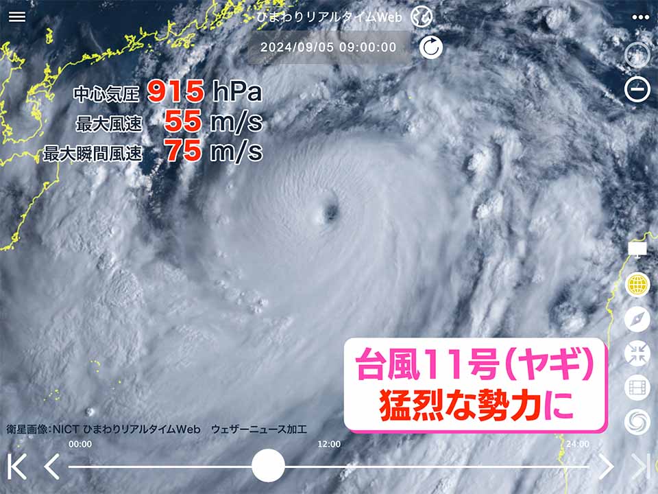 9月1日にフィリピンの東で発生した台風11号はルソン島に上陸した後、南シナ海に進みました。南シナ海の海面水温が高かったことに加え、台風を構成する積乱雲のもととなる大量の水蒸気が供給されたことで急速に発達し、ピーク時には中心気圧915hPa、最大風速55m/sの猛烈な台風となりました。