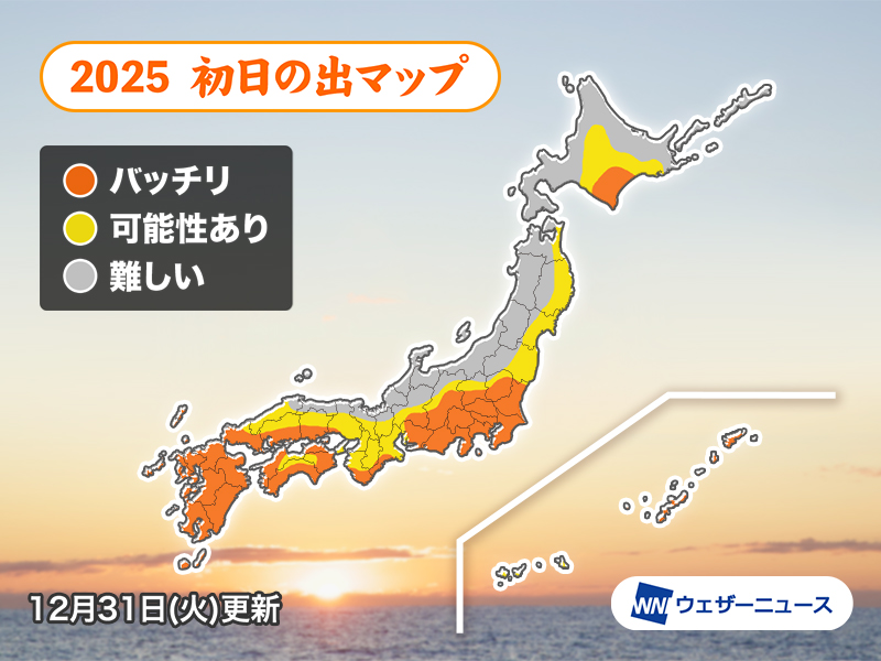 関東から西の太平洋側では晴れる所が多く、初日の出が見られるところが多そうです。ただ、京阪神では日本海から流れてくる雲により初日の出が遮られる可能性も考えられます。