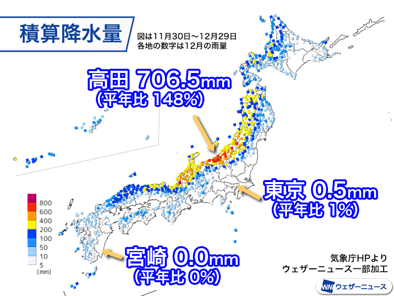 いつもの12月以上に冬型の日が多かったことで、日本海側と太平洋側の降水量の分布が極端になりました。北陸や東北日本海側は平年よりも大幅に多く、新潟県上越市・高田では平年の1.5倍となる700mm以上の降水を観測、青森県青森市・酸ケ湯では12月の観測史上1位となる357cmの積雪を記録しています。