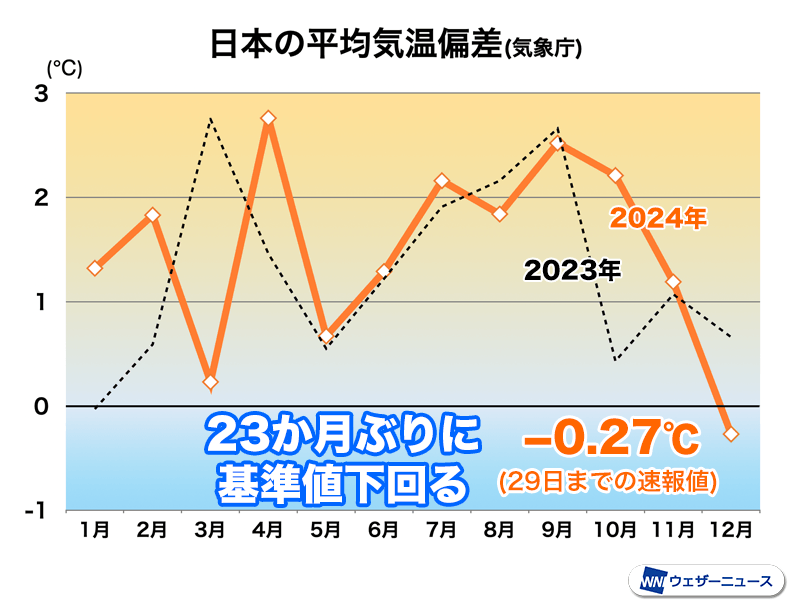12月の日本の平均気温 23か月ぶりに基準値を下回る 寒気の流入が続いた影響