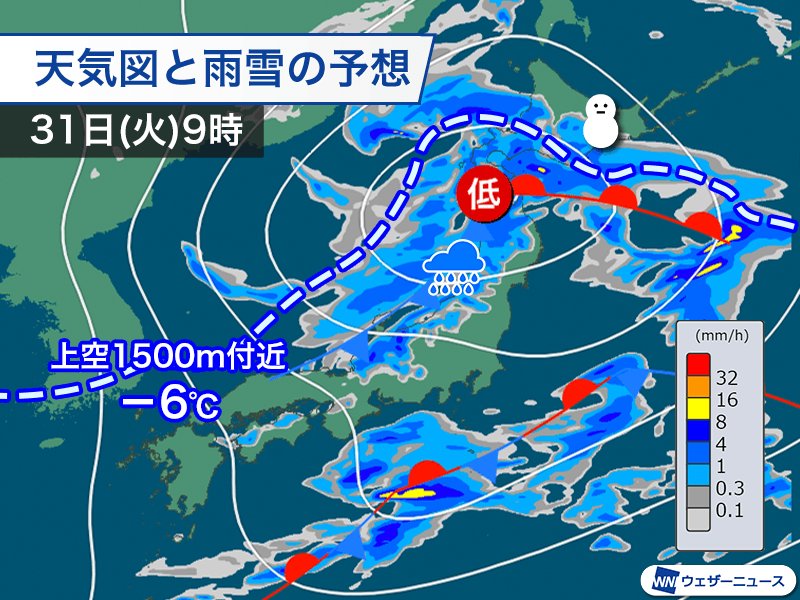 明日31日(火)・大晦日は低気圧が発達しながら北日本を通過するため、大荒れの天気となります。雪や雨、風が強まるため警戒が必要です。