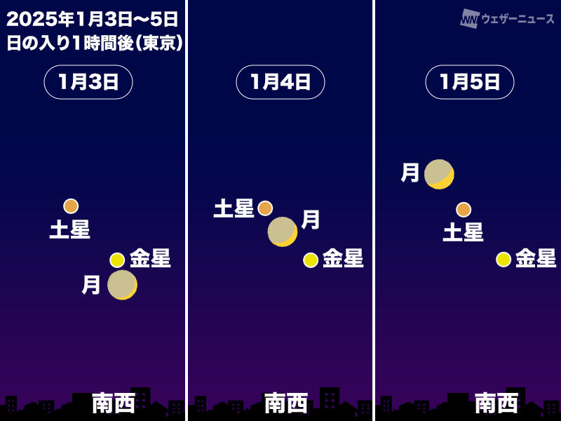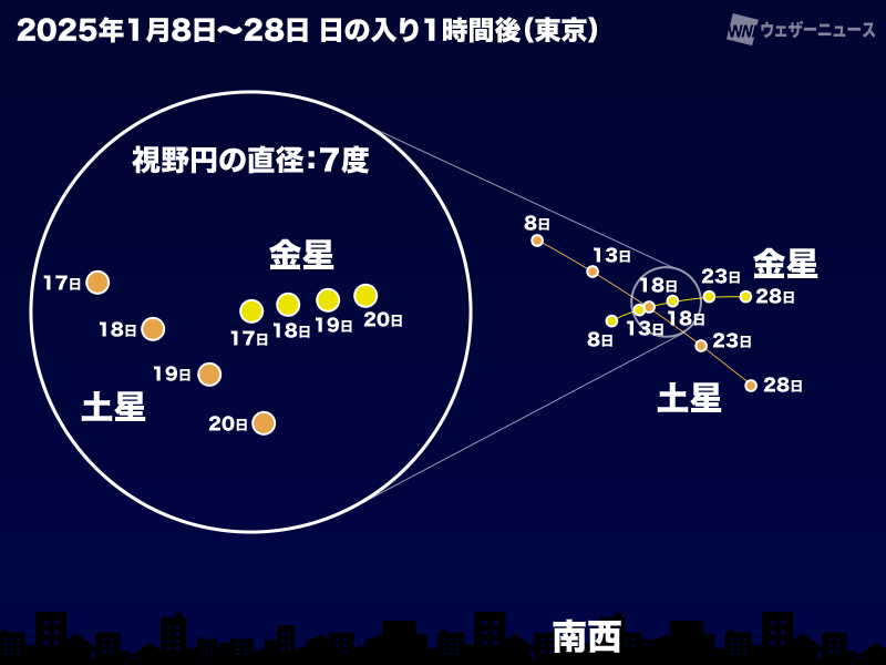 1月は日の入り後の南西の空で、宵の明星である明るい「金星」と「土星」の姿を見ることができます。