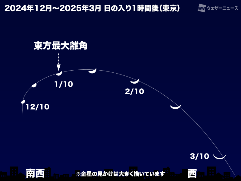 1月10日(金)、「金星」が「東方最大離角」を迎えます。金星はマイナス4.4等級と非常に明るく、日の入り1時間後の高度は約30度(東京)です。