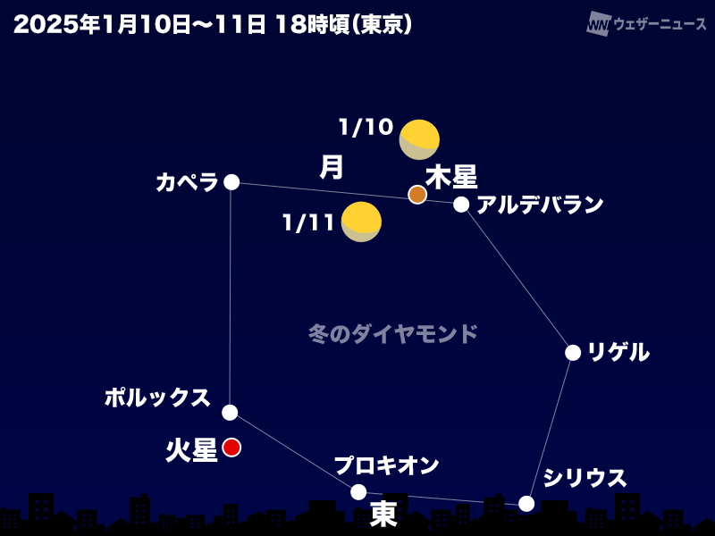 明るさは金星がマイナス4.4等~マイナス4.6等級で非常に明るく、土星は1.2等~1.3等で周りの星座の星々よりも目立つため、2つの惑星は目を引きそうです。