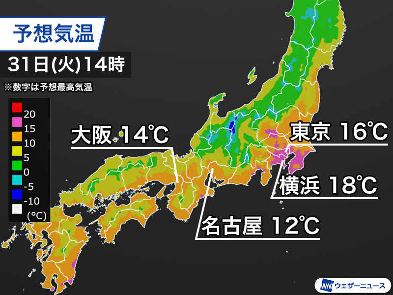 今日31日(火)の関東から九州にかけては雲が多いものの、日差しの届いているところが多くなっています。日本海を東進する低気圧や前線に向かって暖気が北上し、気温が上がってきました。