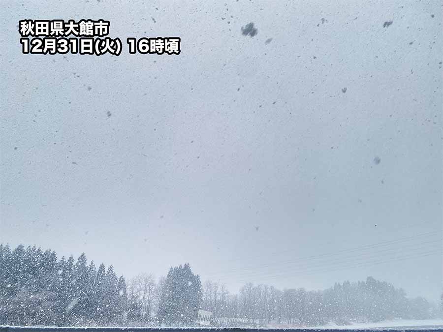 風も強まり、北日本から東日本の広い範囲で平均15〜20m/s、瞬間的には25m/s以上の風が吹き荒れます。日本海側では吹雪による視界不良にも注意が必要です。年越しのタイミングに荒天となりますので、初詣などで夜間に外出を予定している方は十分に注意してください。