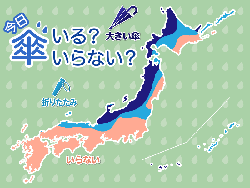 北陸から北の日本海側は雪や雨で、雷を伴って強く降ることがあります。沿岸部を中心に風も強めに吹くため、お出かけの際は大きくて丈夫な傘をお持ちください。