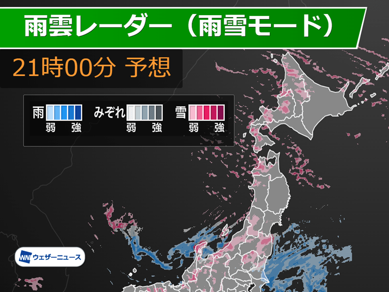 このため北日本の日本海側は雪が降り、北陸から山陰の平野部でも今夜は雨から雪に変わるところが多くなる見込みです。雷を伴い強まる雪や雨、霰(あられ)、突風などにお気をつけください。北日本日本海側や北陸内陸部では積雪の更なる増加に注意が必要です。