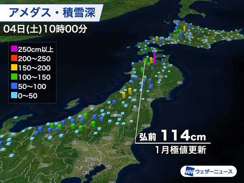 青森県弘前市では昨夜から10cm以上新たな雪が降り、今日10時で積雪が114cmに達しています。