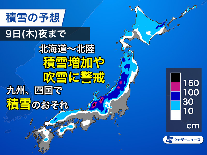 九州や四国の山沿いでも雪の降るところがあり、路面の積雪や凍結が心配です。特に9日(木)から10日(金)は要注意です。