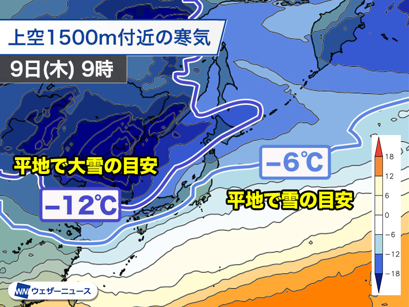 明後日8日(水)から10日(金)にかけては平地で雪を降らせる目安の上空約1,500mでー6℃の寒気が本州の南海上まで南下し、さらに一段強いー9℃の寒気が九州北部や中国地方を覆う予想です。寒気は西回りで流れ込み、西日本では今シーズン一番強い寒気になると見ています。