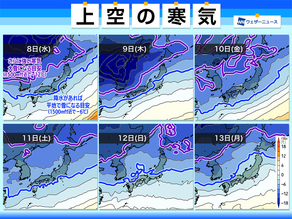 明日8日(水)からは非常に強い寒気が流れ込み、日本海側では雪の強まりや大雪に注意が必要です。東海や西日本の太平洋側にも雪雲が流れ込み、積雪の可能性があります。