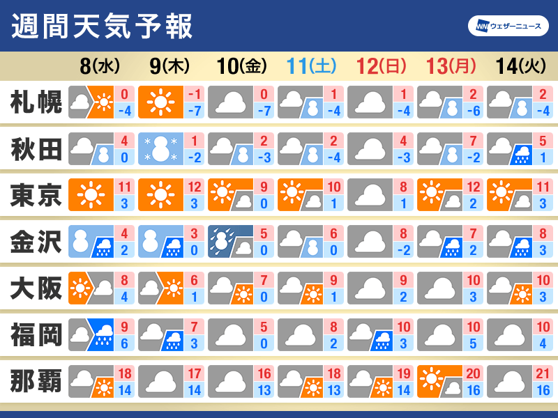 11日(土)頃にかけては西高東低の冬型の気圧配置となり、太平洋側の広い範囲で日差しの届く日が多い見込みです。