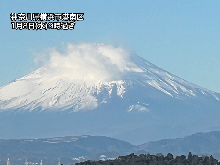 関東から山梨、静岡にかけては昨日よりも雲が少なく、各地できれいな青空が広がりました。6日(月)に通過した低気圧の影響で雪化粧をし直した富士山が、今日は関東平野からも良く見えています。