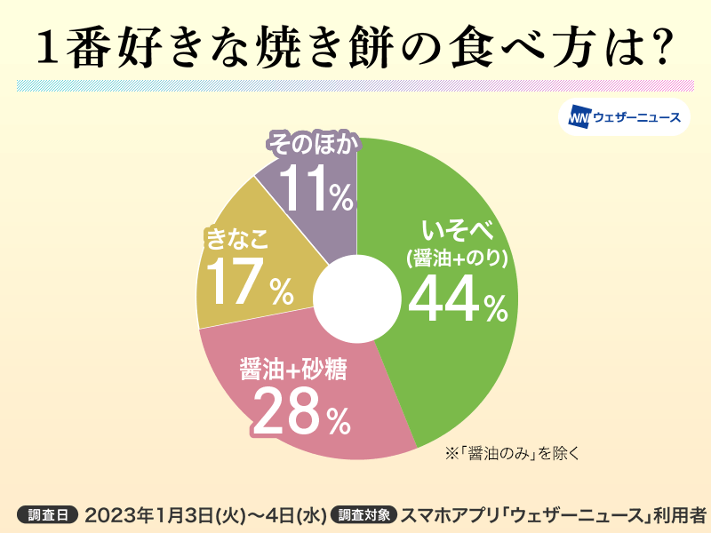 「しょうゆのみ」以外で、好きな焼き餅の食べ方を伺ったところ、1番割合が多かったのは「いそべ(醤油+のり)」で44%でした。次いで「醤油+砂糖」が28%、「きなこ」17%、「そのほか」11%となりました。