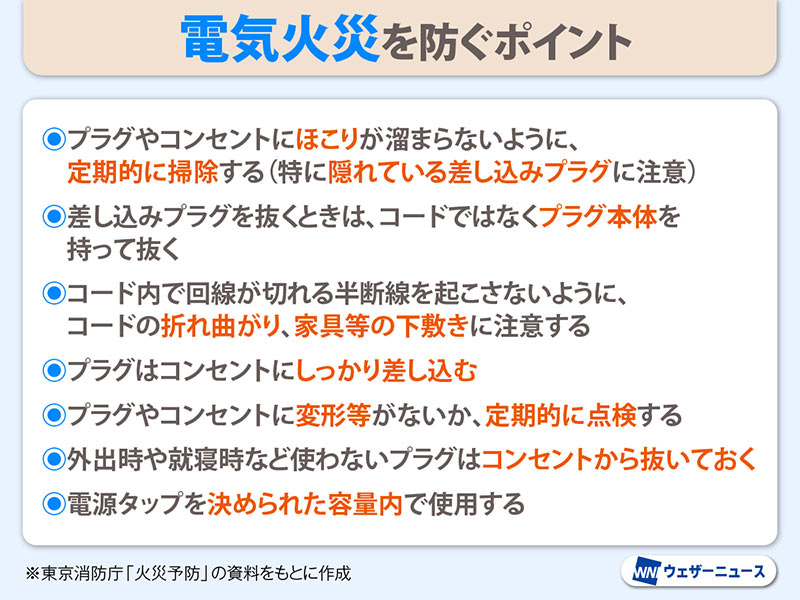 総務省消防庁「住宅における電気火災に係る防火安全対策のポイント」、東京消防庁「火災予防」、同「電気火災」、同「事業所からの電気火災を防ごう!【消防署制作動画・丸の内署】」