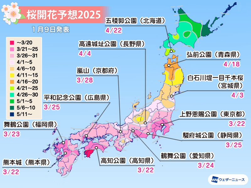 ウェザーニュースでは本日1月9日(木)、2025年の「第一回桜開花予想」を発表しました。ソメイヨシノの開花トップは東京の3月21日の予想で、22日に横浜と高知が続きます。その後、西日本や東日本は平年並みの開花となりそうです。