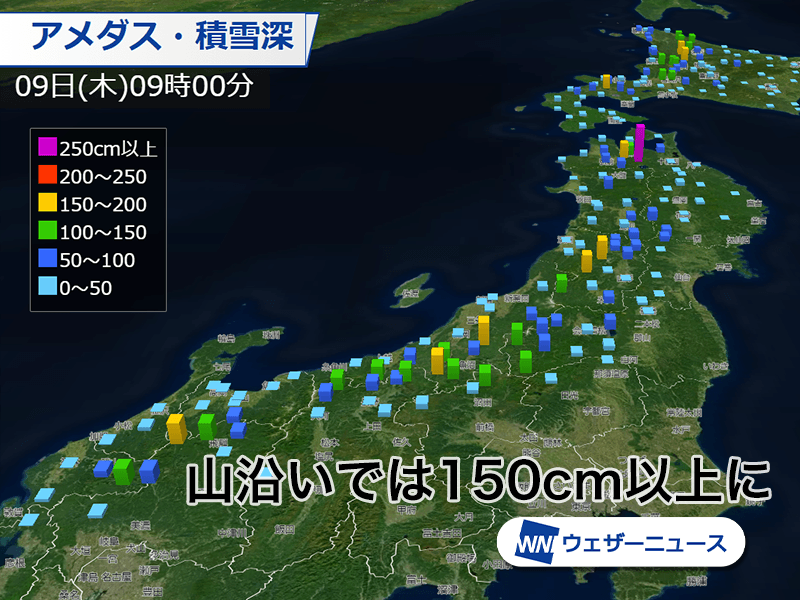 今日9日(木)9時までの24時間に岐阜県白川村で42cmの雪が降り、積雪は159cmとなっています。今朝は富山市や金沢市、福井市といった都市部も雪化粧しています。この後はさらに上空の寒気が強まる見込みです。
