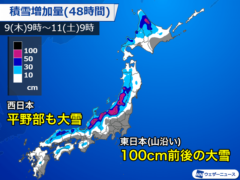 明日10日(金)にかけて、北陸から東北南部の内陸、山沿いでは、局地的にはさらに100cm以上のドカ雪になるとみられます。急激な積雪の増加により立ち往生による大規模な交通障害が起こるおそれがあるとして、国土交通省は気象庁と合同で会見を行いました。