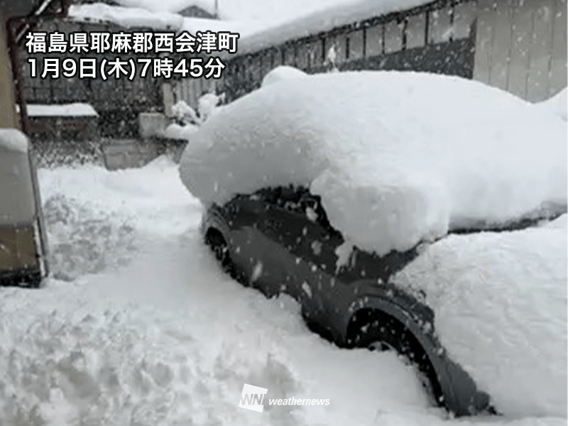 今日9日(木)9時までの24時間降雪量は福島県西会津町51cmで新潟県魚沼市守門42cm、福島県会津若松市でも28cmに達しています。積雪は福島県猪苗代町で80cmを超え、磐越西線の一部で運転を見合わせています。また、上空の寒気が強まった北陸内陸部も積雪が増えています。
