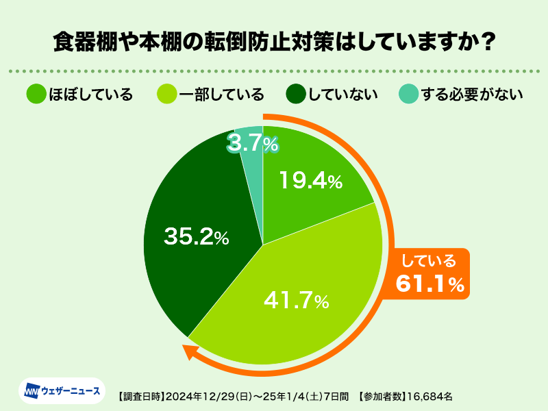 調査の結果、食器棚や本棚の転倒防止対策を実施している人の割合は、61.1%であることがわかりました。また2023年8月に実施した調査と比較すると、対策をしている人の割合はほとんど変化していませんでしたが、”一部”ではなく「”ほぼ/大体”対策をしている」と回答した人が、7.9ポイント増加しました。つまり、部分的な対策から包括的な対策へと進展していると推測されます。