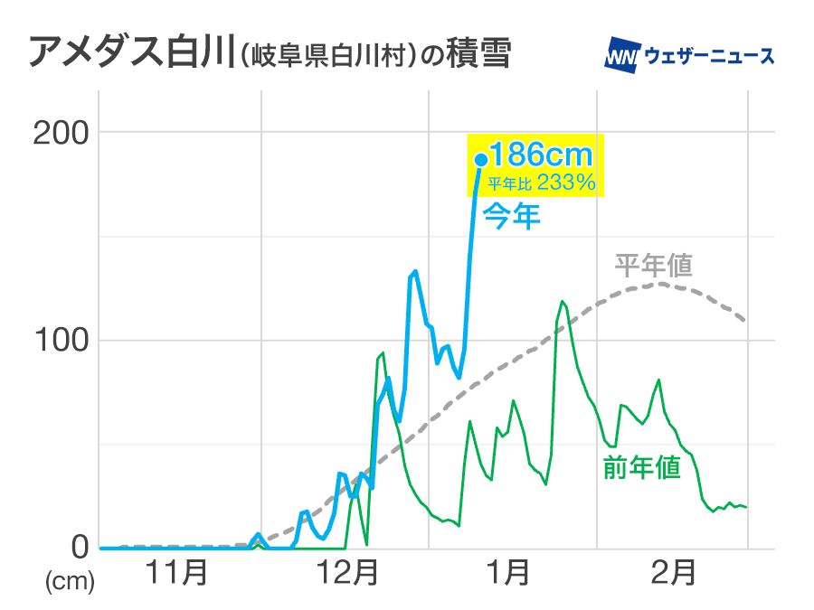 積雪深(地面からの雪の厚み)は山形県大蔵村のアメダス肘折で199cm、新潟県魚沼市のアメダス守門で195cm、岐阜県白川村のアメダス白川で186cmに達しました。いずれも平年のこの時期よりも積雪が深くなっていて、前年の冬の最大値を超えているところも多くなっています。
