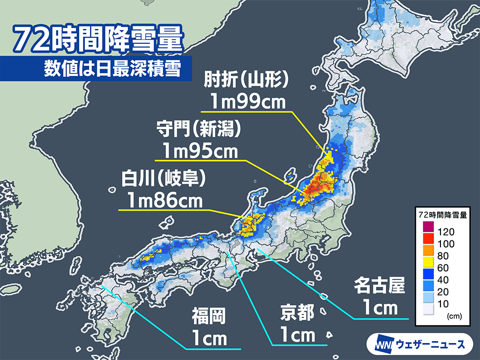 日本海側では1月8日(水)から断続的に雪が降り、積雪が増しています。発達した雪雲の流れ込みが続いた新潟県や山形県、福島県会津、岐阜県飛騨・美濃での積雪増加が顕著になっていて、72時間降雪量は岐阜県白川村のアメダス白川で128cm、福島県金山町のアメダス金山で116cmを観測するなど、この3日間で1m以上の雪の降ったエリアが広がりました。