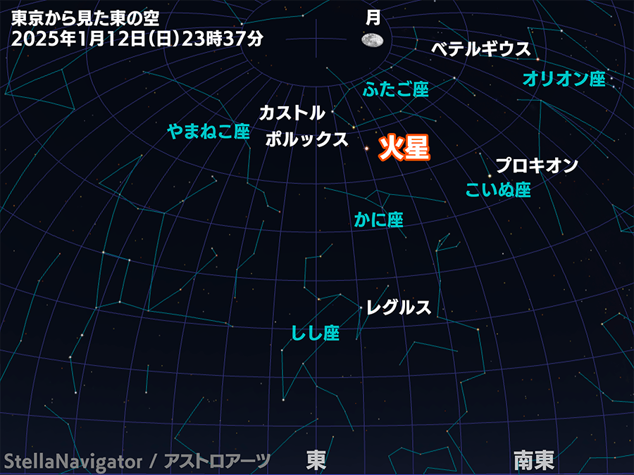 今夜の火星は日暮れの東の空から昇り、明日の朝に西の空に沈んでいきます。最接近時刻の22時37分には、東の高い空に昇っています。ほぼ真上で輝く月よりは低く、ふたご座のカストル・ポルックスの近くに位置します。東から南の空には明るい恒星もたくさんあるため、大変賑やかに感じられそうです。