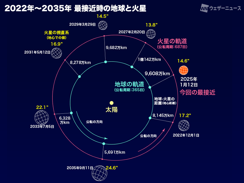 国立天文台「ほしぞら情報2025年1月 火星が地球に最接近(2025年1月)」、アストロアーツ「【特集】火星(2025年1月12日 地球最接近)」