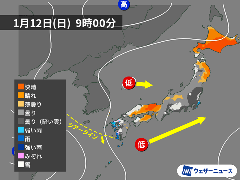 三連休2日目の今日1月12日(日)は、2つの低気圧が太平洋と日本海を東進します。東日本や西日本の広範囲で雲が優勢となり、一時的に雨や雪の降る可能性があります。九州の内陸部では積雪に注意してください。各地とも空気の冷たい一日になりそうです。