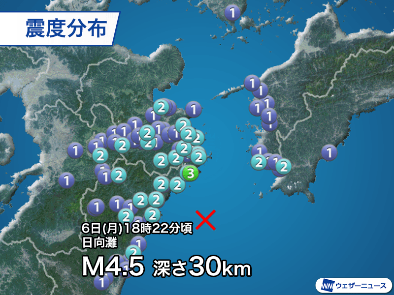 6日(月)18時22分頃、日向灘を震源とするマグニチュード4.5、深さ30kmと推定される地震が発生しました。この地震で大分県佐伯市で最大震度3、宮崎県や大分県、高知県などで震度2の揺れを観測しています。
