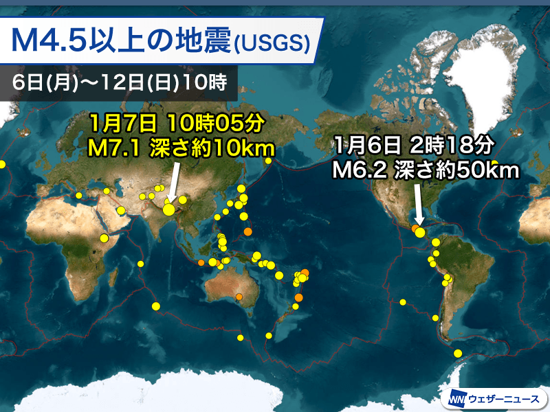 アメリカ地質調査所の解析によるマグニチュード6以上の地震は2回発生しました。最も大きな地震は中国・チベット自治区で発生したマグニチュード7.1です。