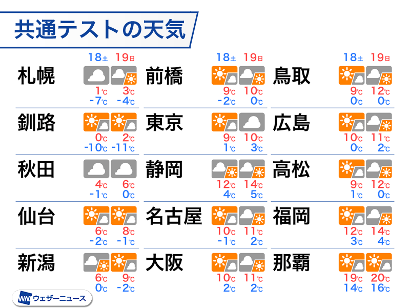 全国的に朝晩は冷え込み、特に18日(土)は名古屋市でも冬日の予想となっています。昼間との気温差が大きくなりますので、試験に向かう際の服装には注意が必要です。