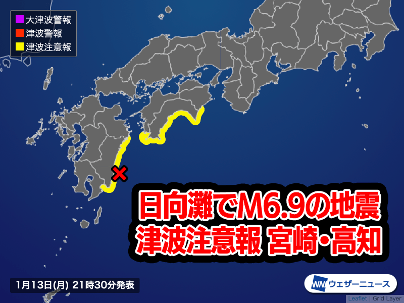 震源地は日向灘(宮崎の東南東20km付近)で、震源の深さは約30km、地震の規模(マグニチュード)は6.9と推定されます。
