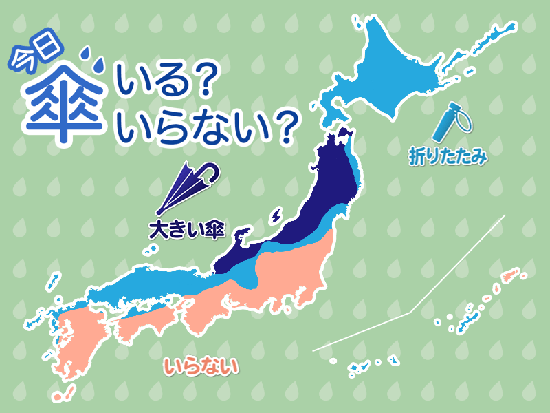 北海道や東北太平洋側では、日差しの届くことがあっても雨や雪の可能性があります。西日本の日本海側でも天気はゆっくり下り坂で、雨や湿った雪の可能性があります。お出かけの際は折りたたみ傘をお持ちください。