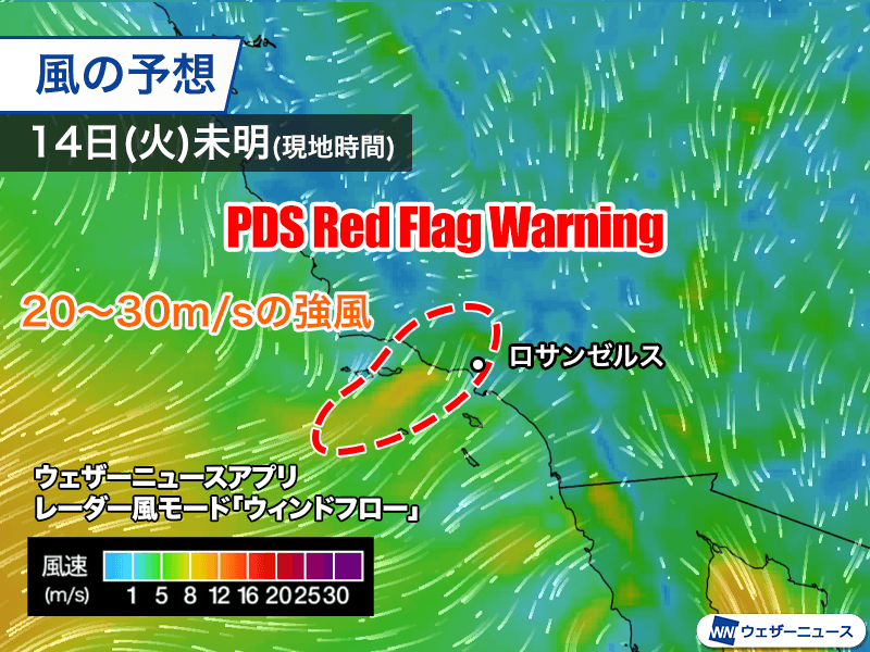 この後はまた風が強まって最大風速は20〜30m/sに達するとみられます。湿度は8〜15%まで低下し、山火事の拡大リスクが高まる見通しです。気象当局は14日(火)朝から15日(水)昼を対象に通常のRed Flag Warningよりも一層の警戒を呼びかけるPDS Red Flag Warning(火災警報)を発表しました。