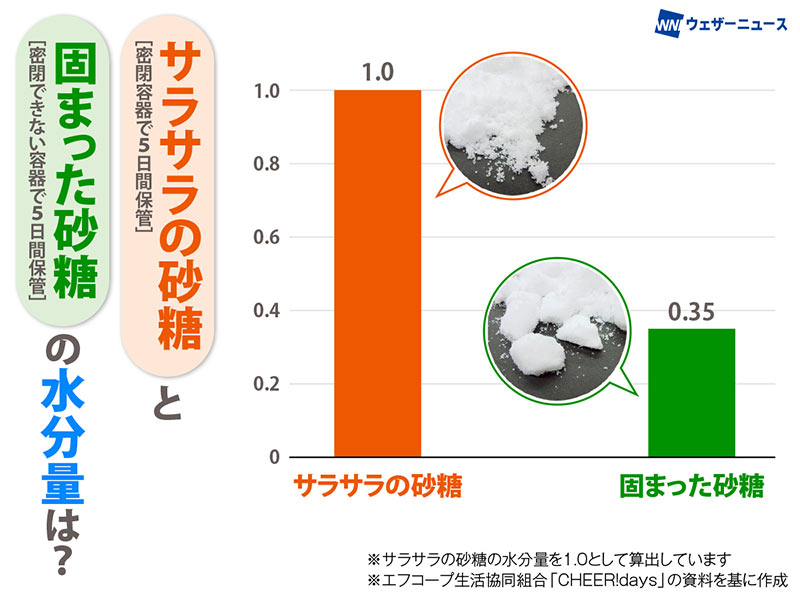 実際、サラサラの砂糖と固まった砂糖の水分量はどのくらい違うのか、比較したグラフを見ると、固まった砂糖はサラサラの砂糖に比べて65%も水分量が少なく乾燥していることが分かります。